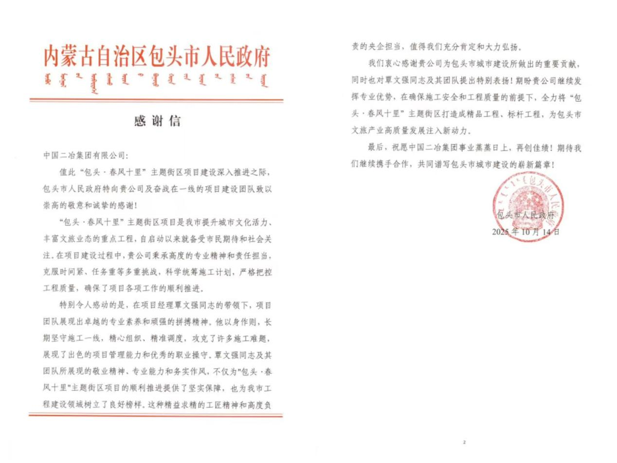 這封感謝信不僅是對(duì)中國二冶項(xiàng)目團(tuán)隊(duì)攻堅(jiān)克難、高效履約的高度認(rèn)可,更是對(duì)中國二冶秉持工匠精神、踐行央企責(zé)任擔(dān)當(dāng)?shù)挠辛τ∽C。中國二冶將以此為激勵(lì),持續(xù)發(fā)揮專業(yè)優(yōu)勢(shì),在嚴(yán)守施工安全與工程質(zhì)量的前提下,全力將“包頭?春風(fēng)十里”主題街區(qū)打造成精品工程、標(biāo)桿工程,為包頭市文旅產(chǎn)業(yè)高質(zhì)量發(fā)展注入更多二冶力量。
